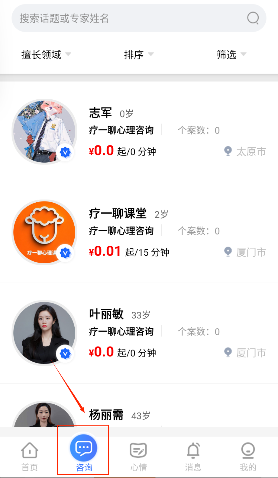 2、智能筛选功能可按咨询师资质、擅长领域、用户评分等10余项条件精准匹配最适合的专家。