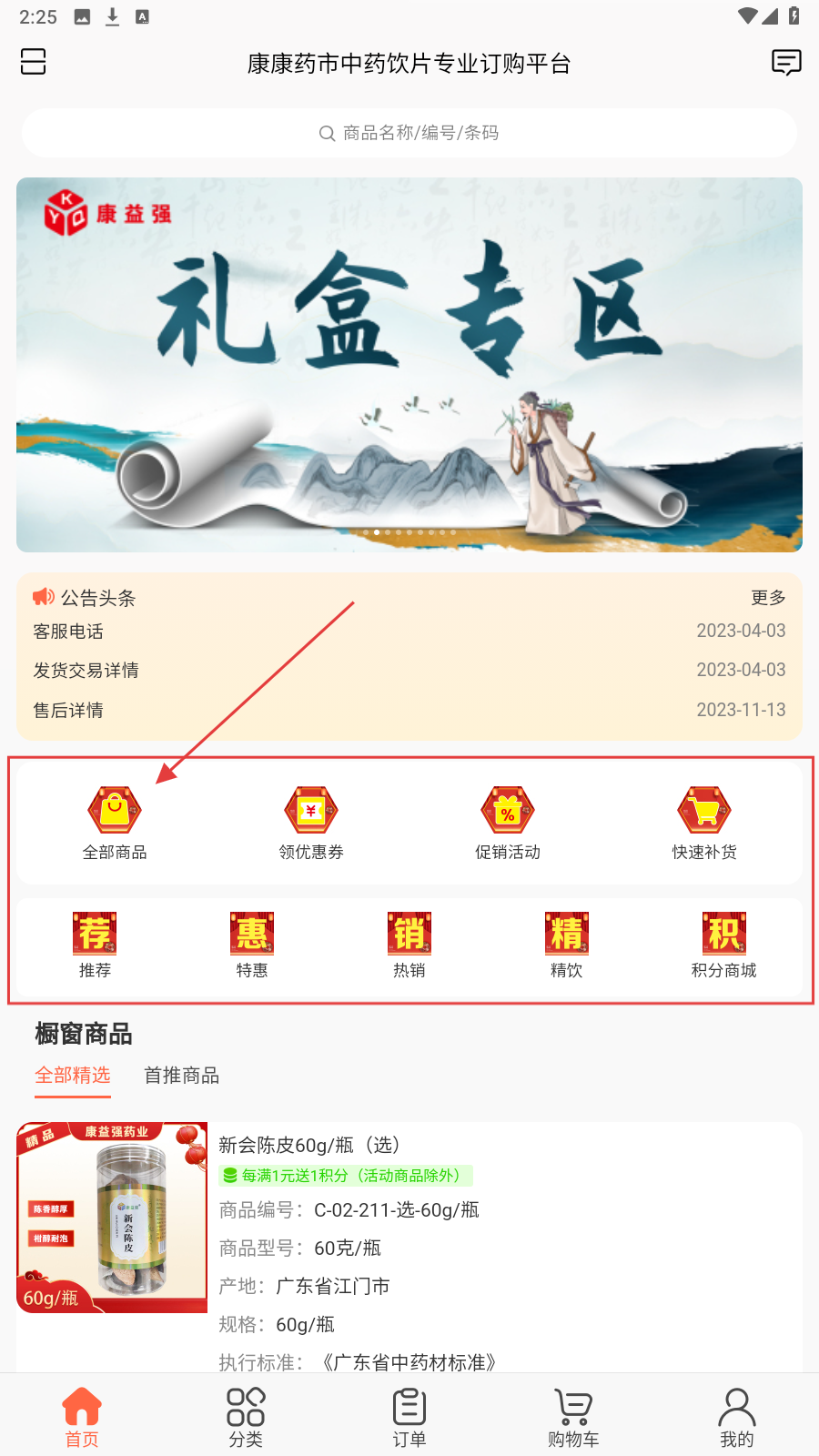 1、进入【康康药市】首页,点击【全部商品】,浏览平台在售中药饮片。