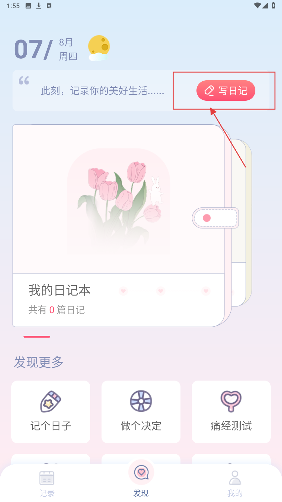 3、进入【发现】页,点击【写日记】,可记录经期生活,留存日常感受。