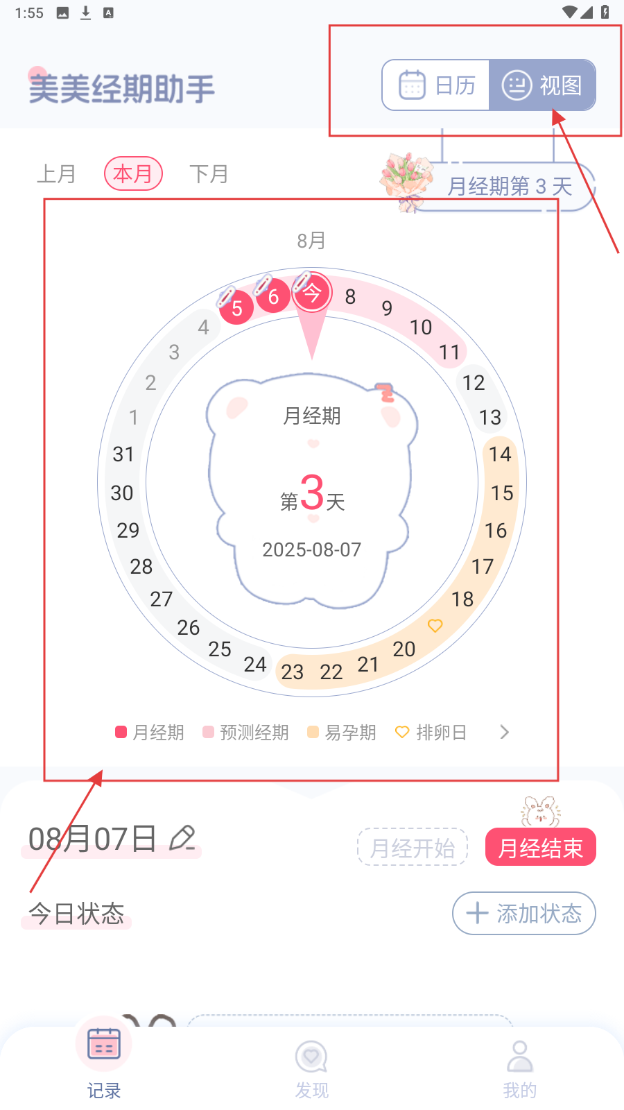 2、切换至【视图】模式,通过环形日历,直观查看经期进度与周期分布情况。