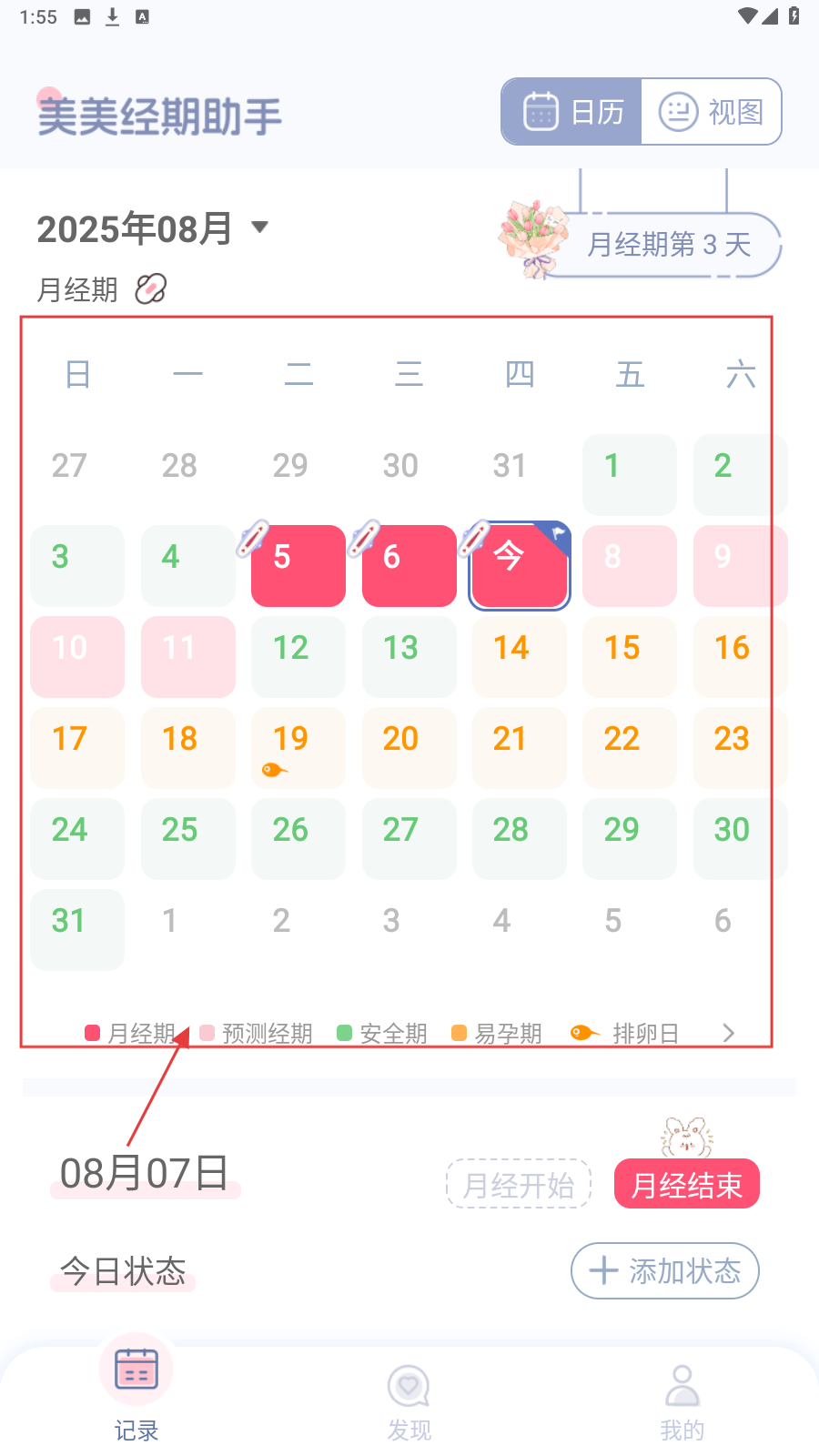 1、在【美美经期助手】日历视图,依据彩色标识,快速识别【月经期】【易孕期】等周期阶段。