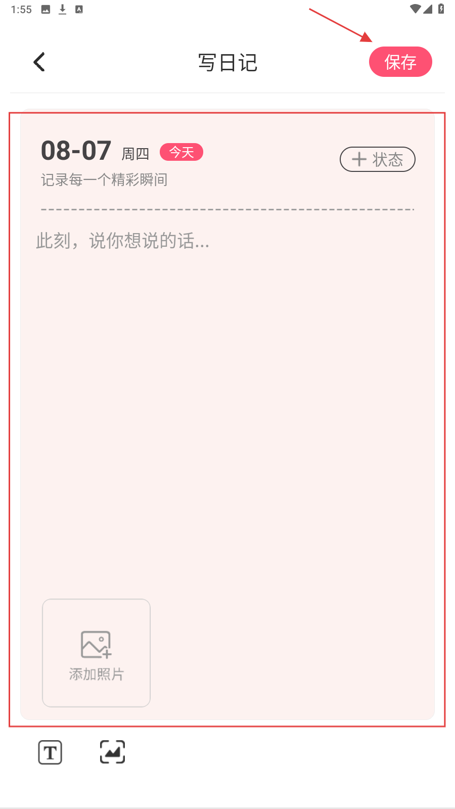4、在【写日记】界面,填写内容后点【保存】,完成经期生活记录操作。