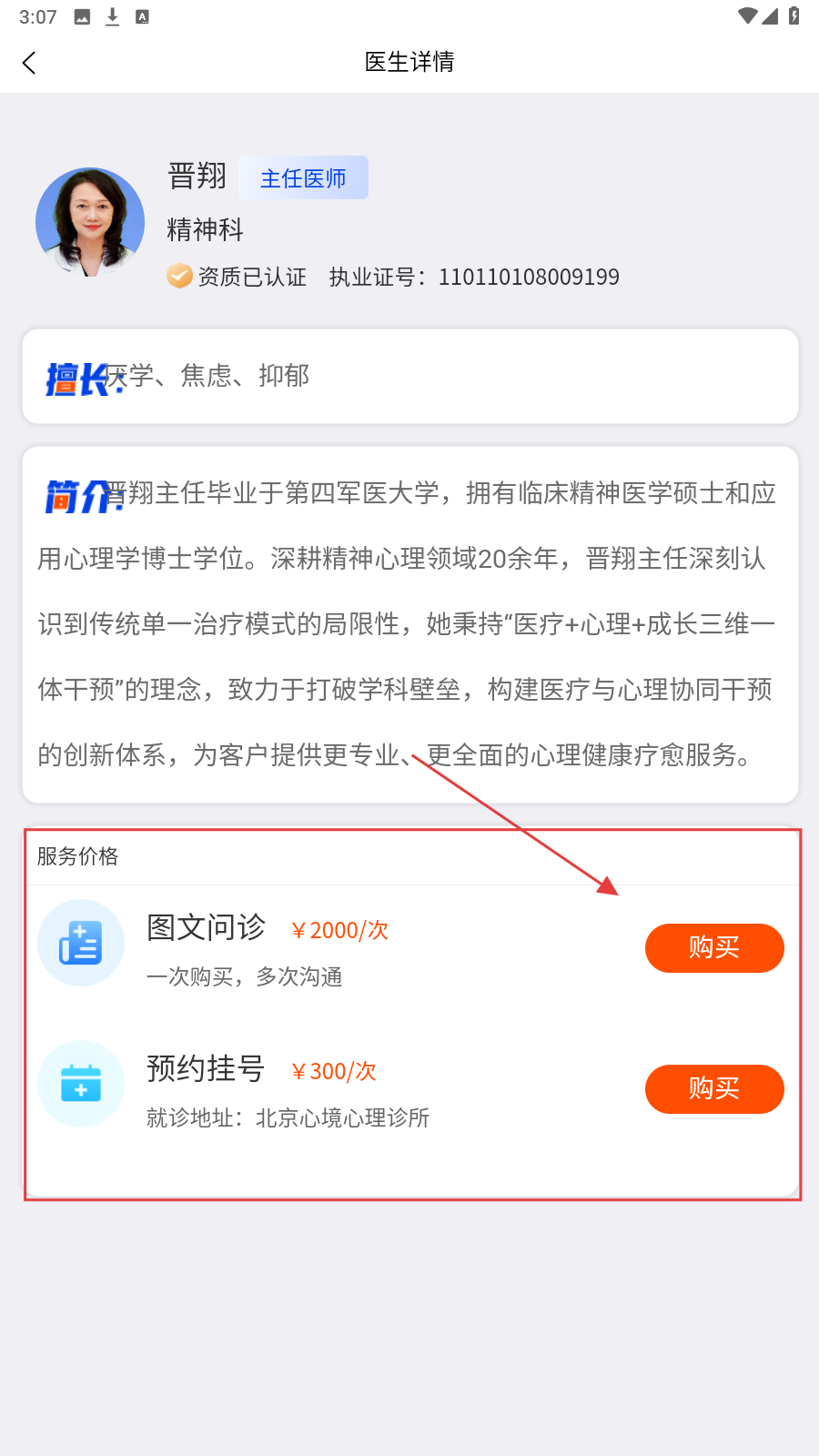 3、进入医生详情页,确认【图文问诊】或【预约挂号】,点击对应【购买】。