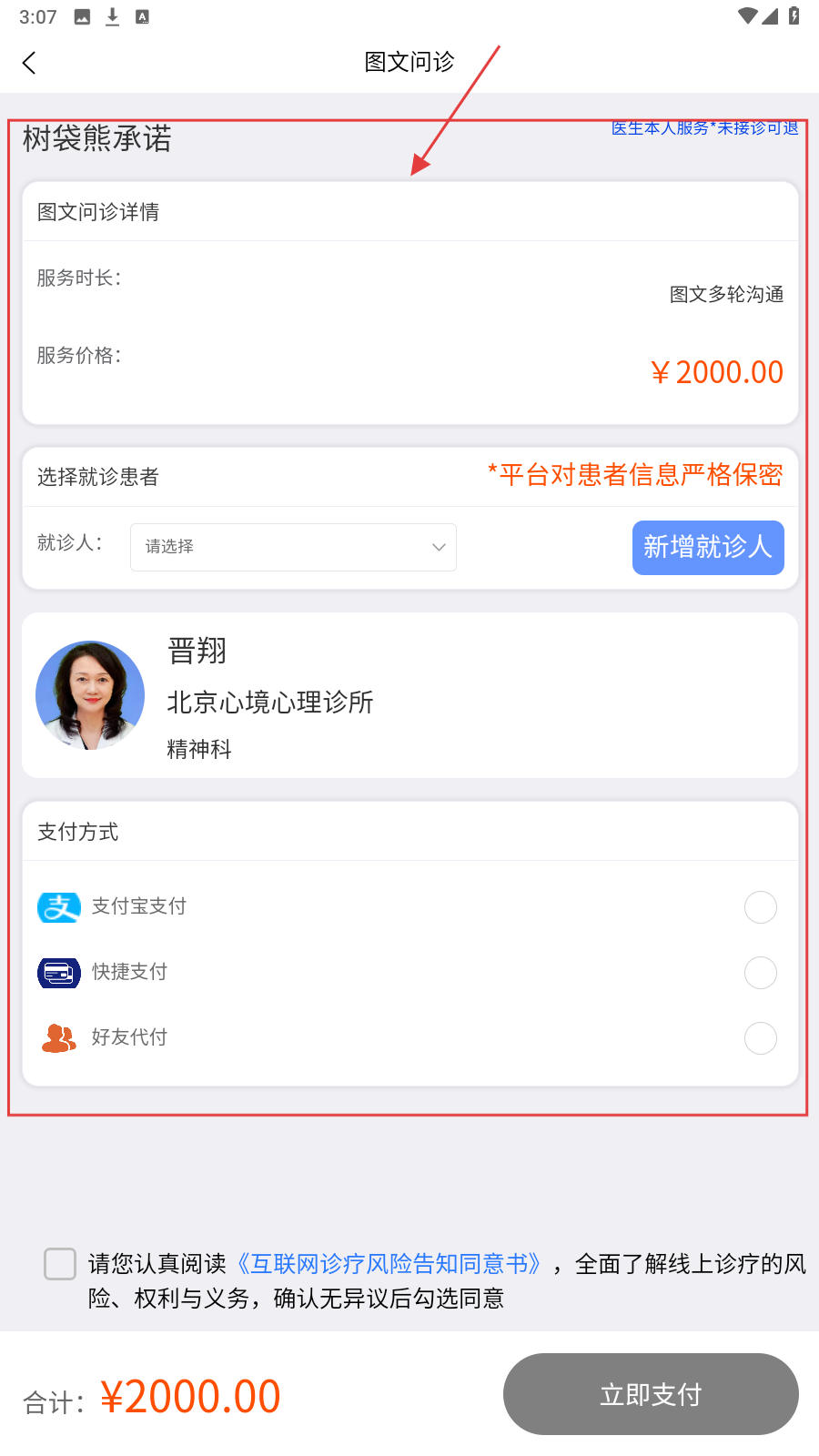 4、填写问诊信息,选支付方式,勾选同意书后,点【立即支付】完成问诊预约。
