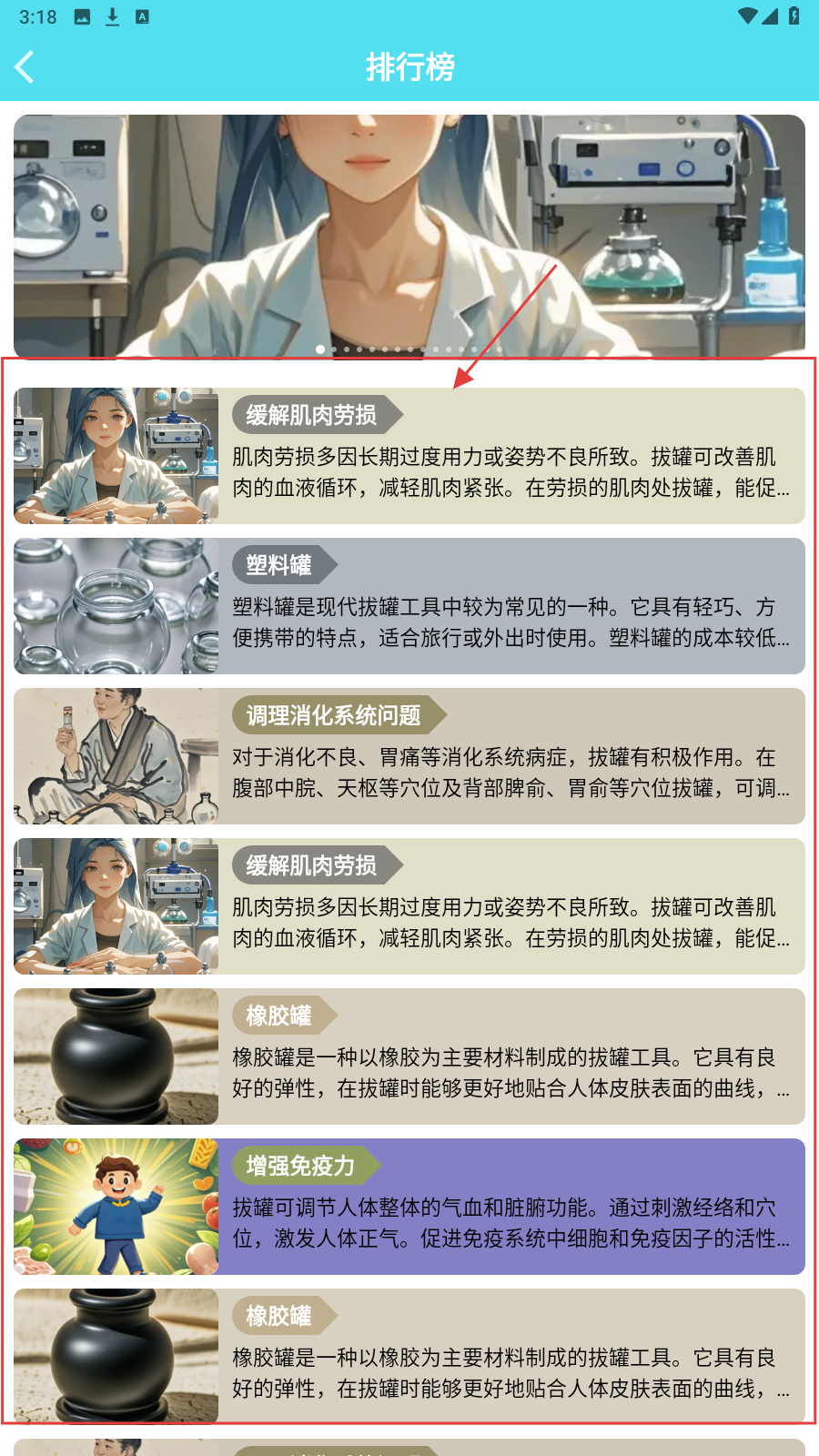 4、切换到【排行榜】,看缓解肌肉劳损等拔罐知识排行,获取实用内容。