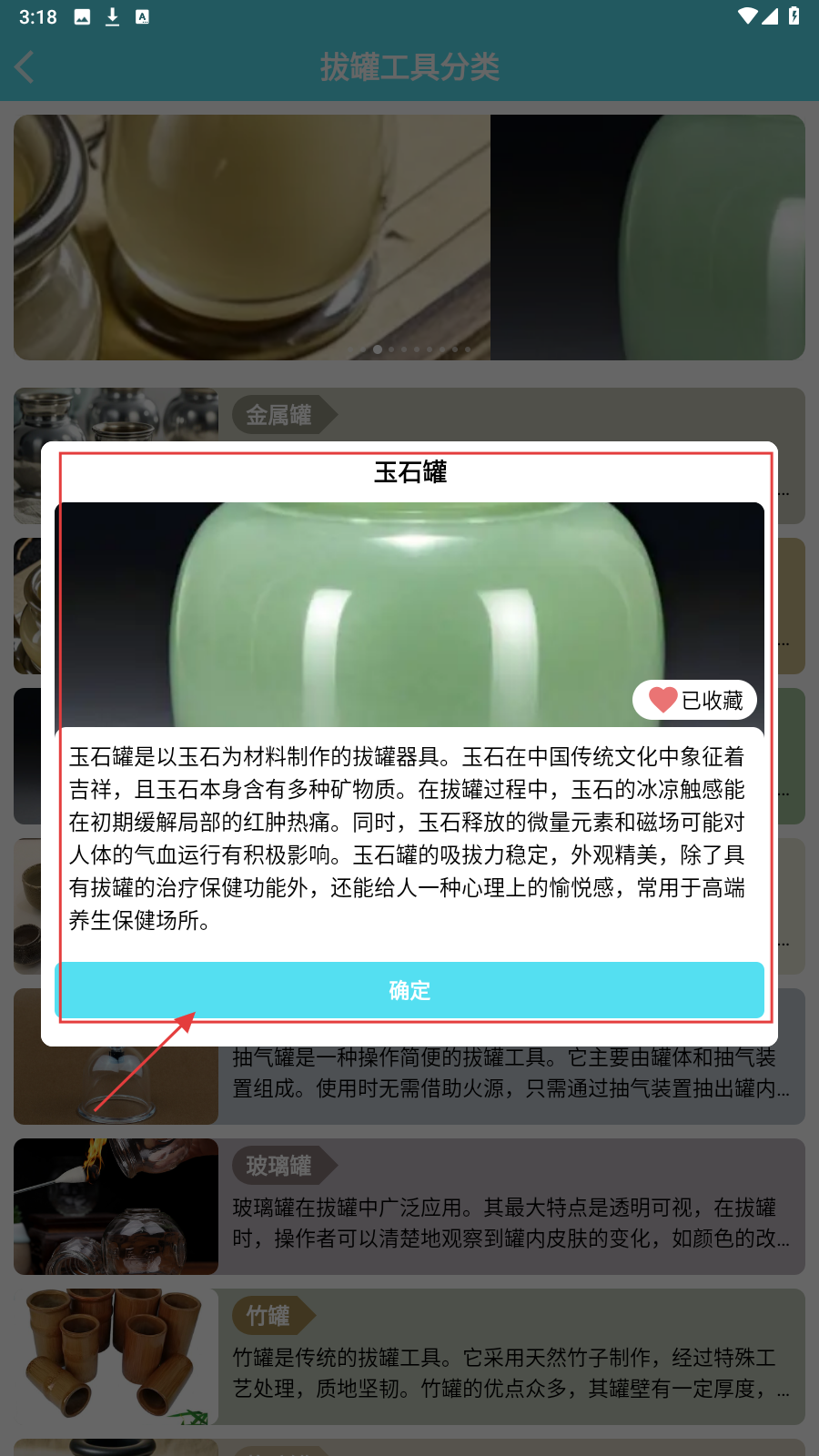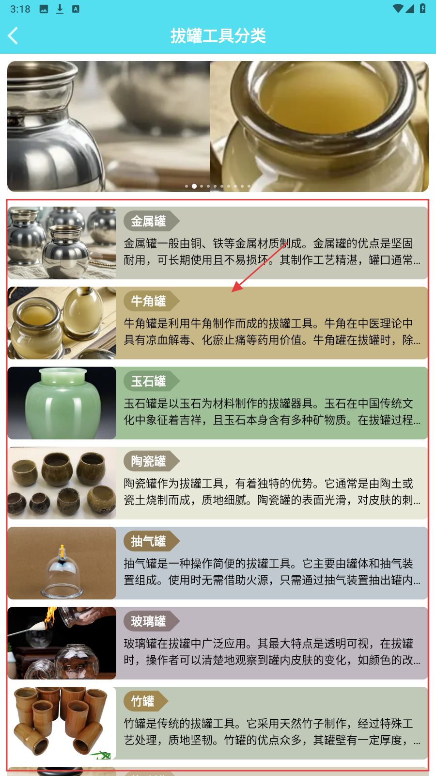 2、在工具分类页,浏览金属罐、牛角罐等介绍,挑选感兴趣的拔罐工具。
