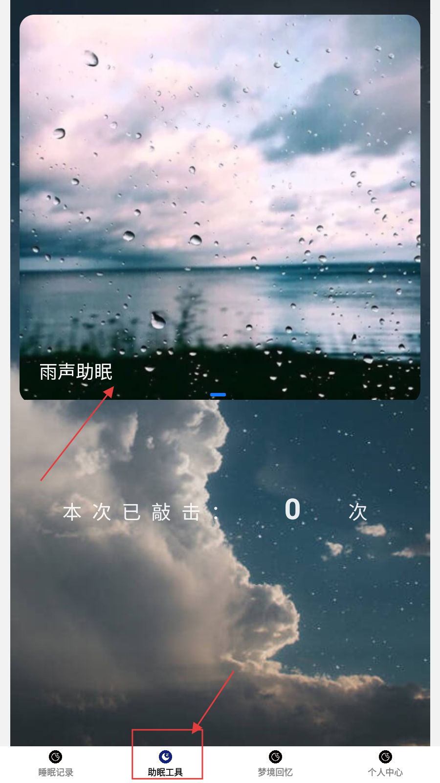 3、切换到【助眠工具】页,选择【雨声助眠】,借助环境音辅助入睡。