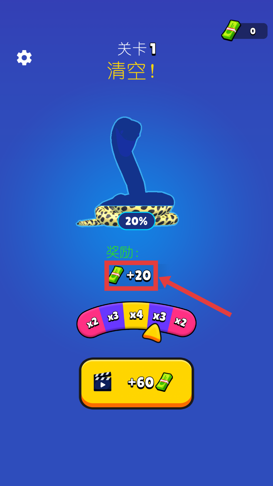 4、完成【关卡1】后显示【清空!】,获得【 20】钞票奖励,也可看广告得【 60】,积累货币用于后续强化。