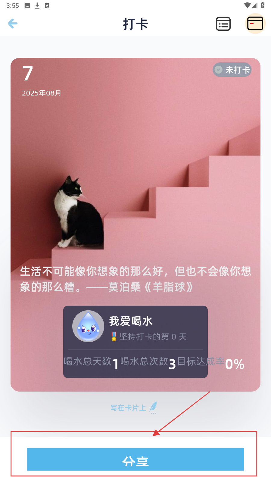 3、完成喝水记录后,进入【打卡】页,点【分享】,可分享打卡内容。