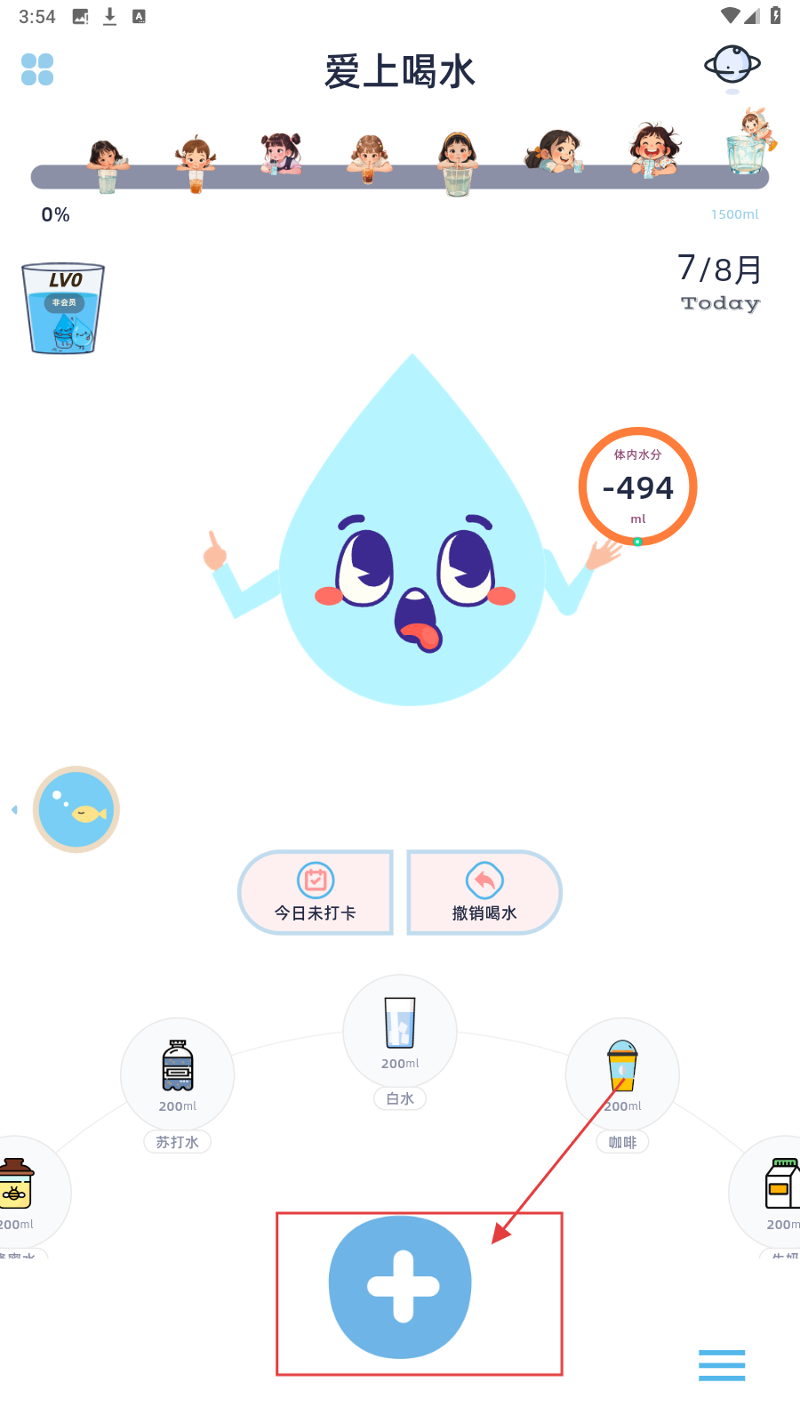 1、打开【爱上喝水】页,点底部【 】,进入饮品选择界面。