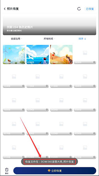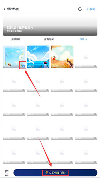 2、点击照片恢复之后,你就可以看到这些历史照片,然后选中你要恢复的照片,再点击下方的立即恢复即可。