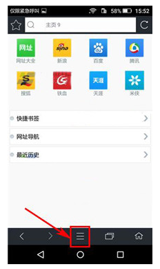 1、打开米侠浏览器,点击下方中间的【三横】,如图所示。