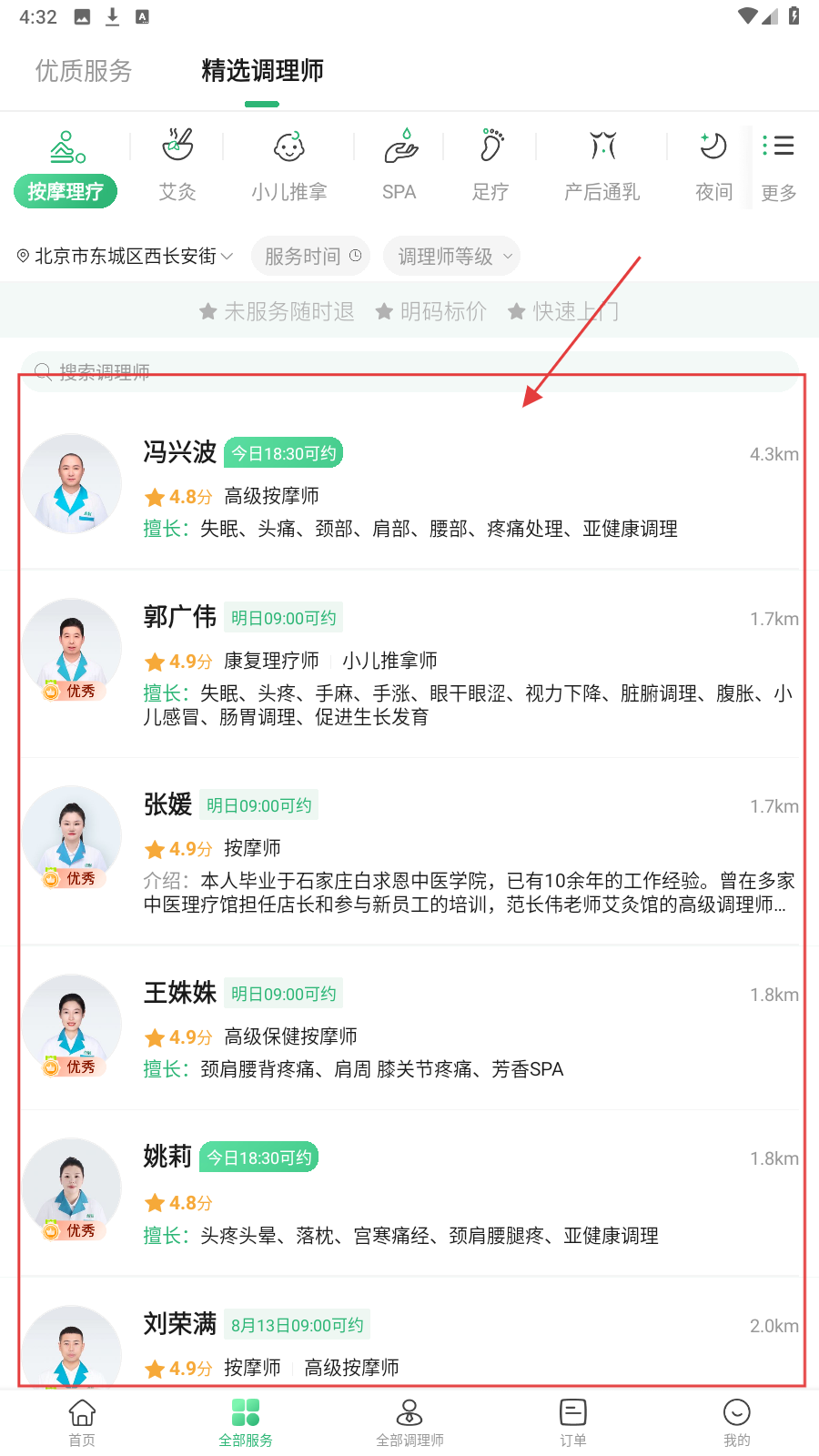 2、在【全部服务】页,切换【优质服务/精选调理师】,找心仪按摩项目。