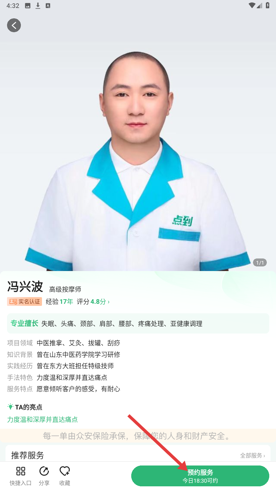 4、打开调理师详情,确认专业、擅长等,点【预约服务】,约对应时间按摩。