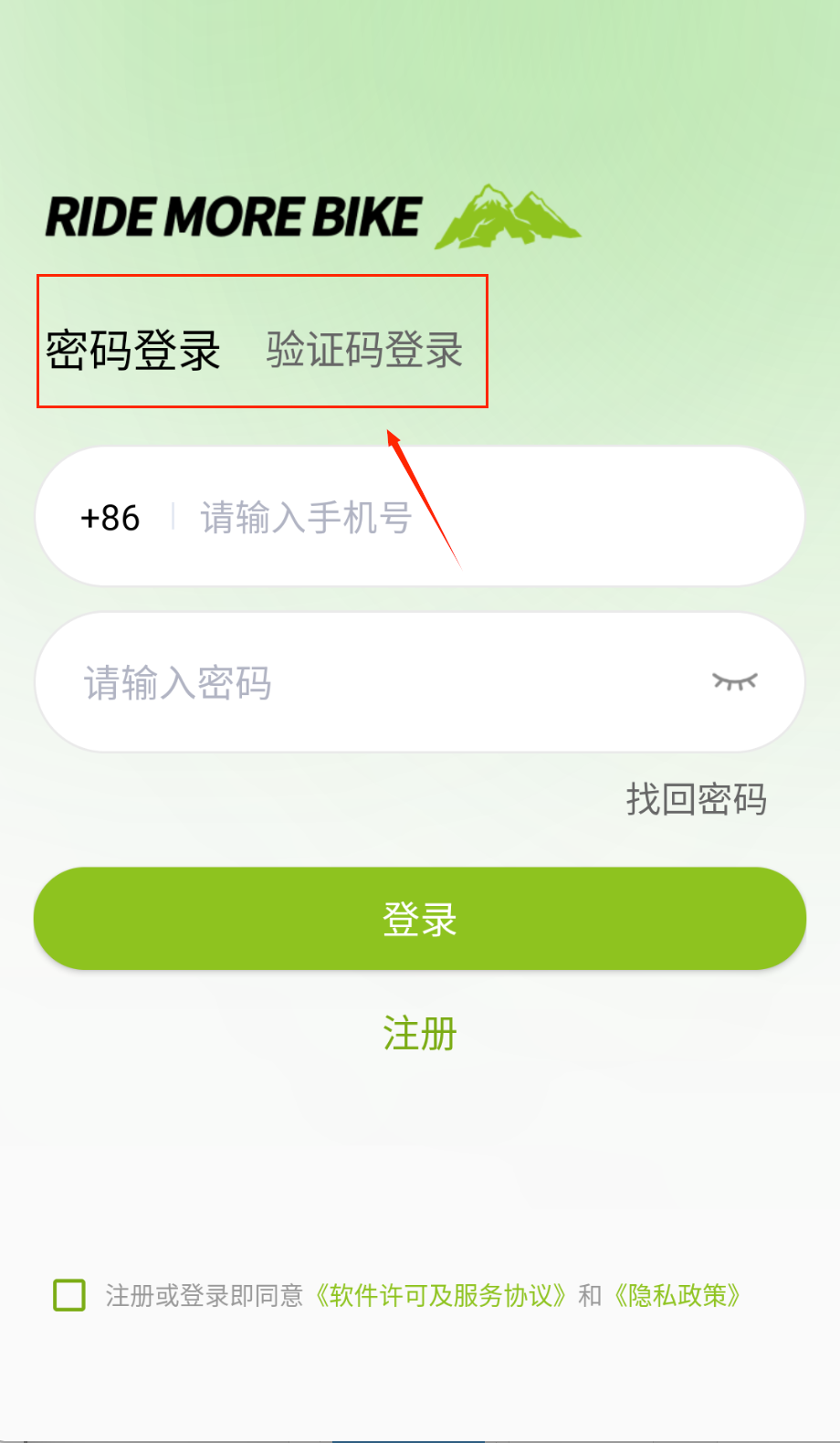 4、登录前千万勾选协议小框框哦,用短信登录就等验证码发来填,点绿色登录键就能开始记录骑行车啦。