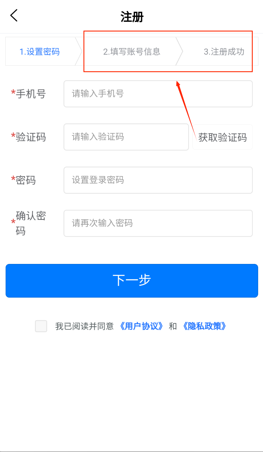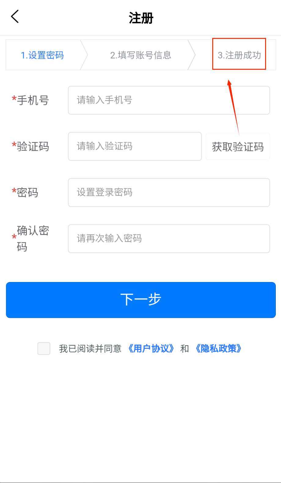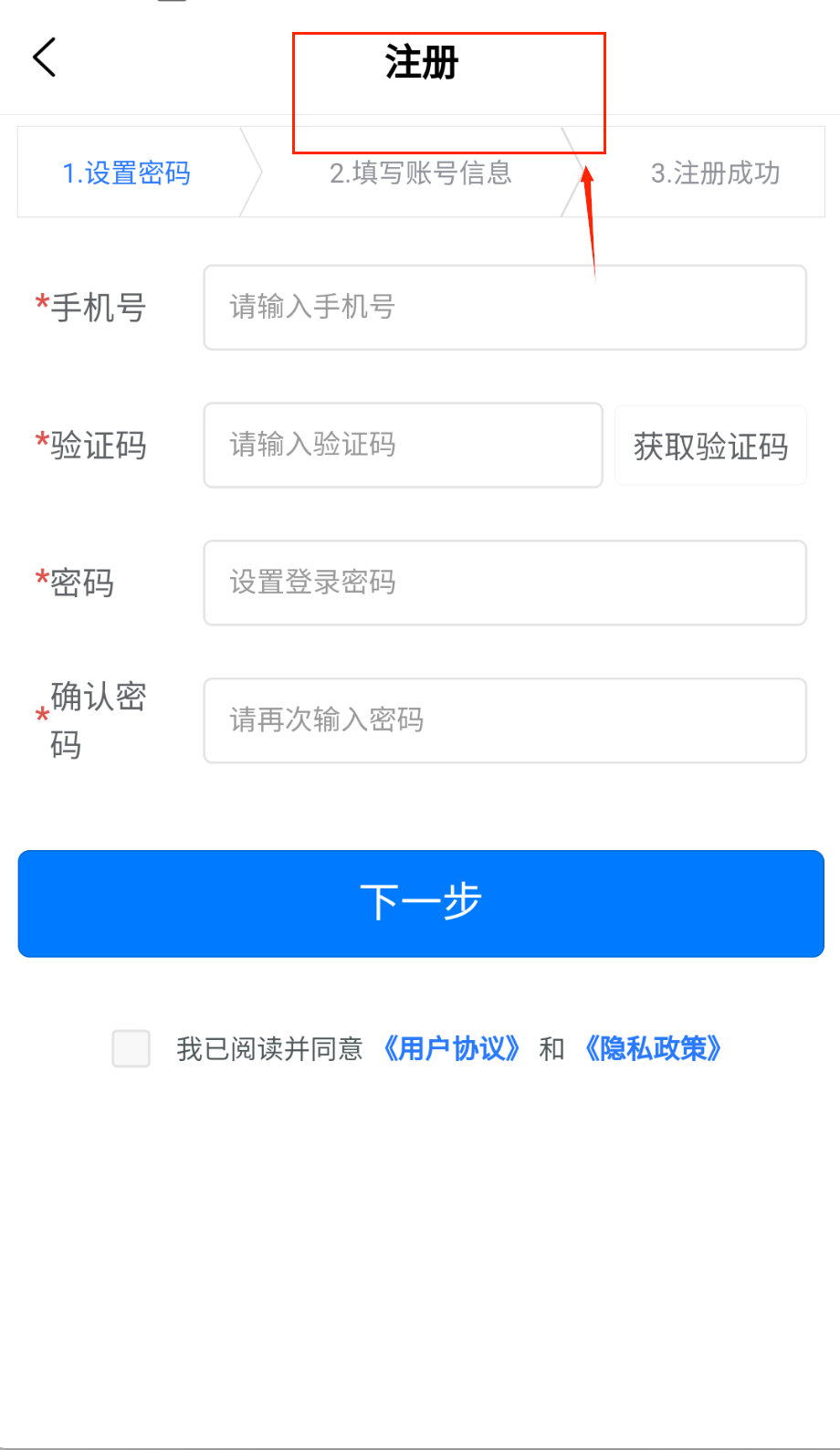 1、打开软件点立即注册进入页面,按提示填手机号收验证码,再设置好密码确认一遍别输错,记得勾选同意用户协议那个小方框哈。