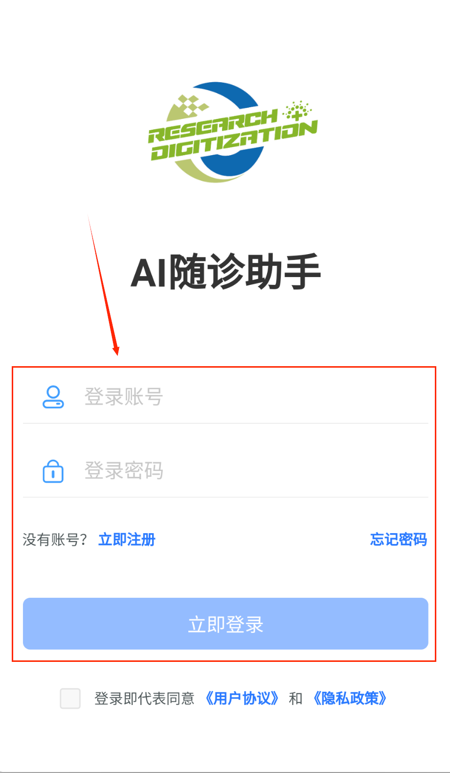 4、登录时输入注册的账号密码,要是忘记密码点蓝字找回,勾选协议框再点立即登录就能进软件啦。