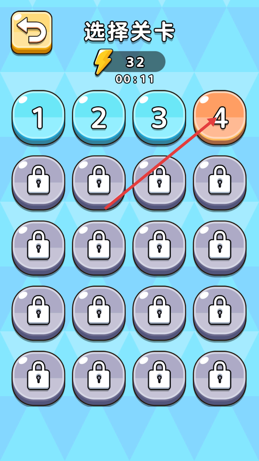 1、在【选择关卡】界面点击【4】号关卡,消耗【32】体力进入第4关,优先挑战解锁后续关卡。