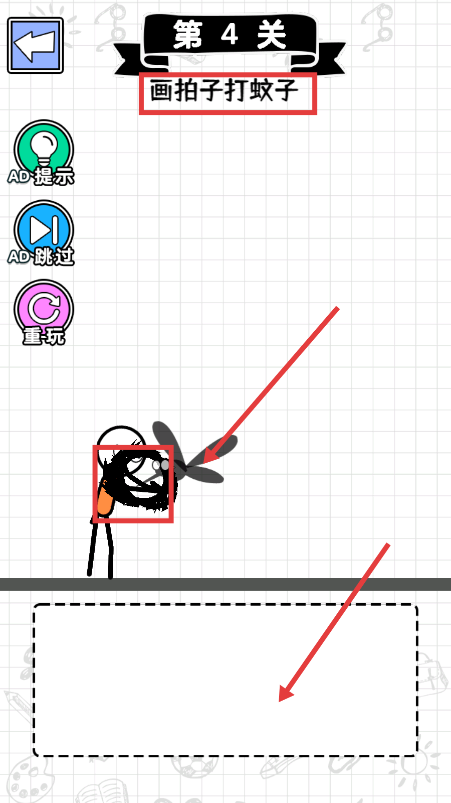 3、根据【画拍子打蚊子】提示,在蚊子飞行路径画封闭图形作拍子,精准击打蚊子完成目标。