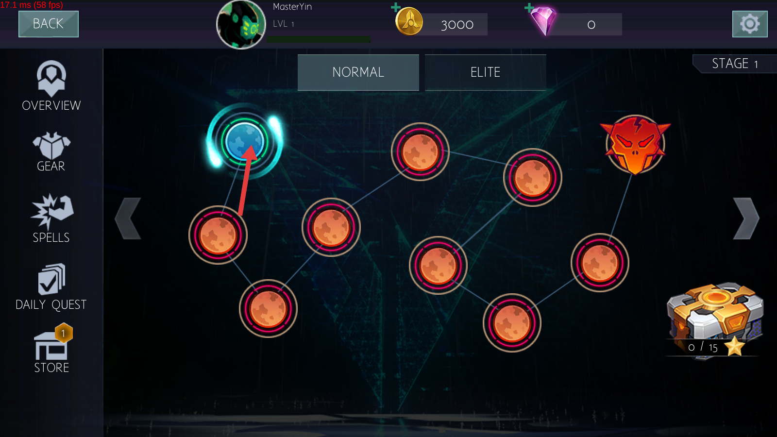 1、在【NORMAL】模式选蓝色节点,开启【STAGE-1】,角色【MasterYin-LEVEL-1】携3000金币备战首关。