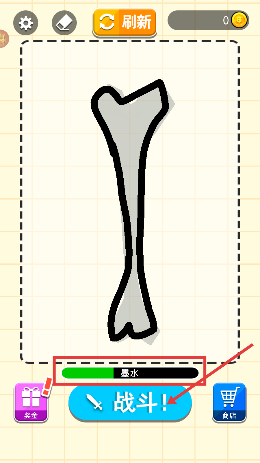 2、在红色框内沿灰色轮廓绘画(如骨头形状),消耗下方【墨水】条,完成武器设计。