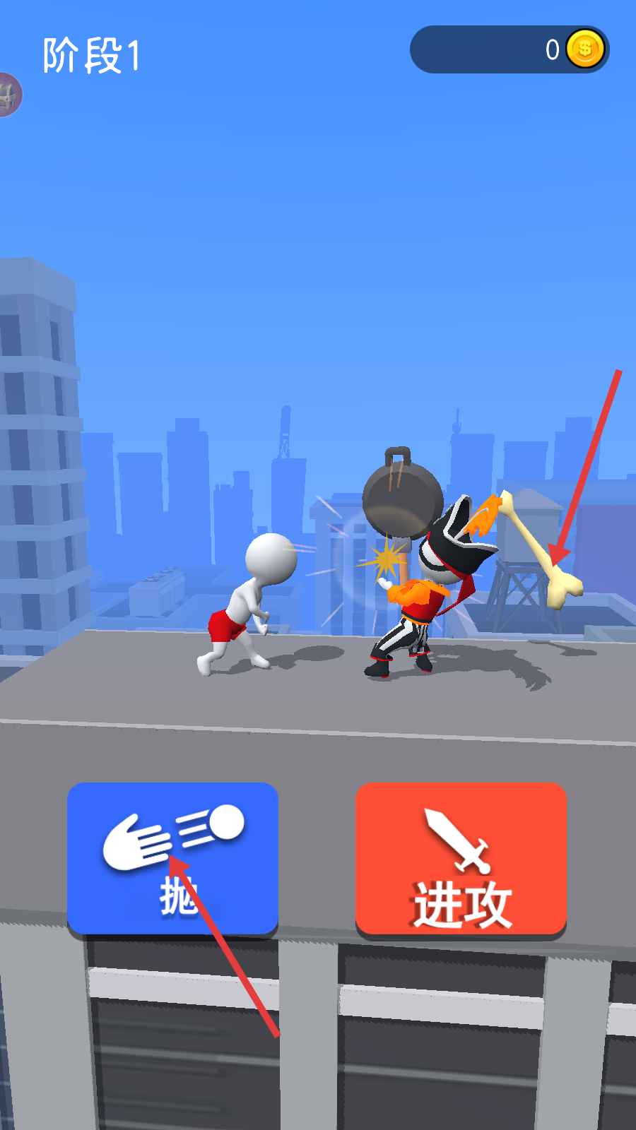 4、战斗时点击【抛】按钮,投掷绘制的武器(如骨头)攻击敌人,推进战局。