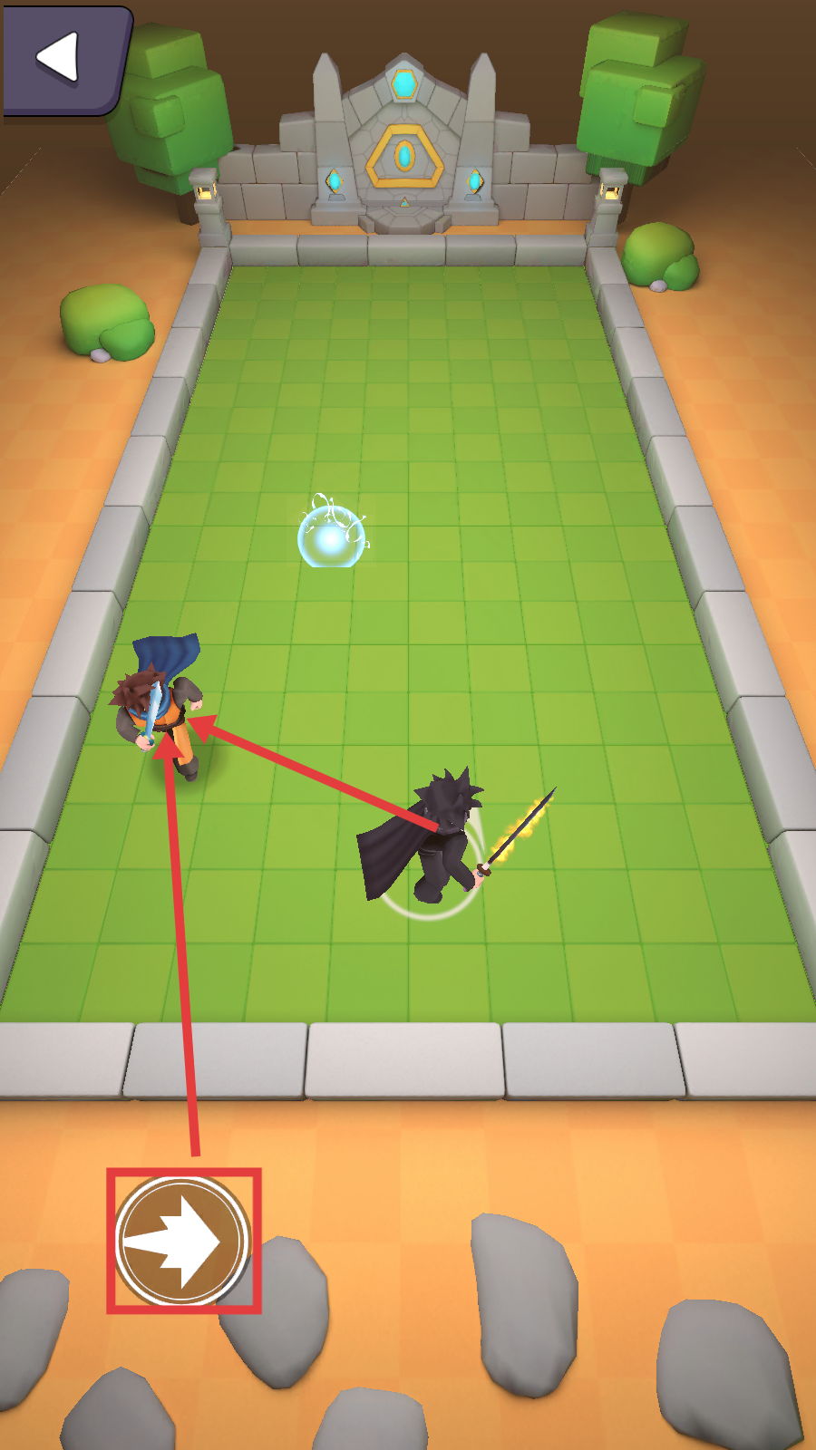 3、场景中出现蓝色雷球时,优先移动角色躲避其雷球,其次是追逐并击杀敌人。