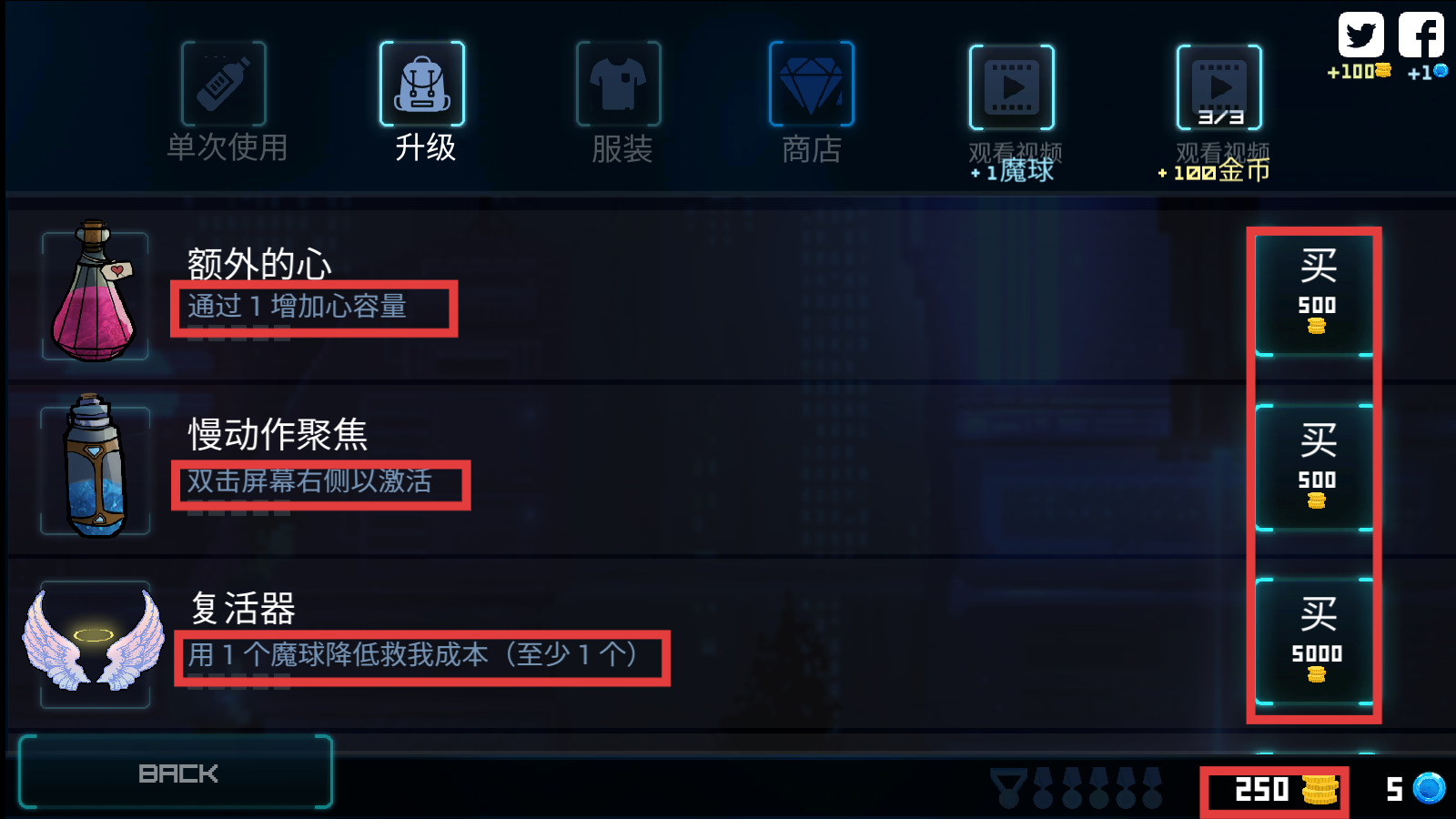 1、在升级界面优先购【额外的心-500金币】增心容量,再买【慢动作聚焦-500金币】提升操作流畅度。