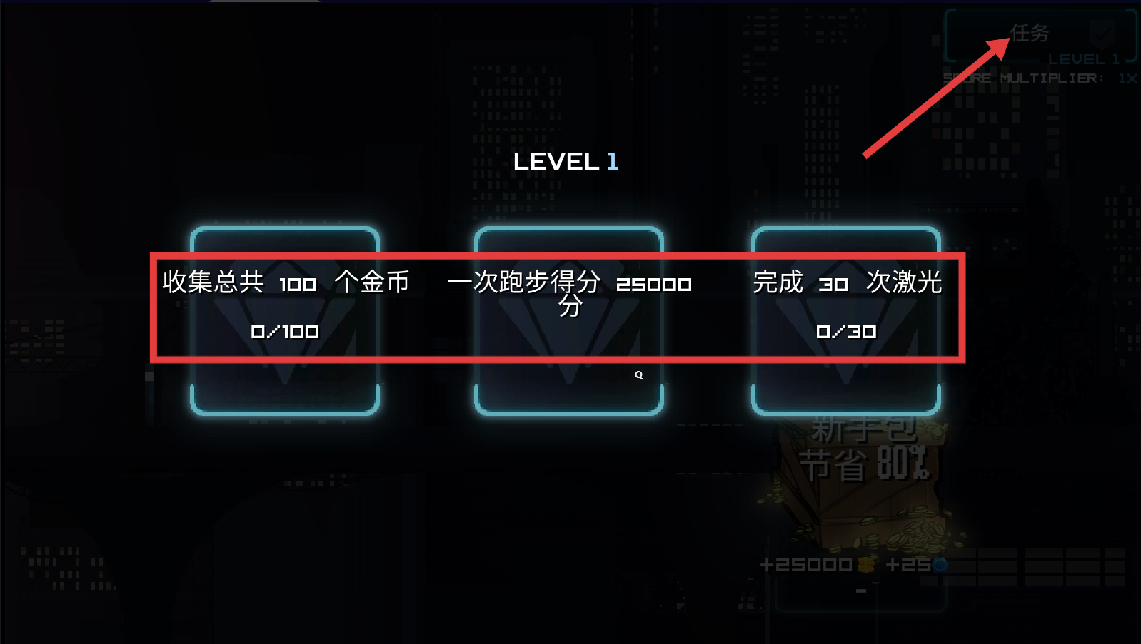 2、完成【收集总共100个金币】【一次跑步得25000分】【完成30次激光】任务,跑酷时多收集金币积累得分。