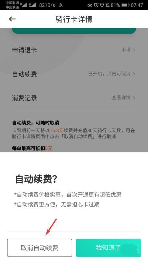 在骑行卡详情页面,点击【自动续费】,点击【取消自动续费】。