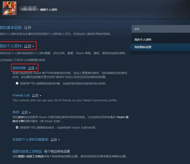 1. 登录steam客户端,按照路径个人资料-编辑个人资料-我的隐私设定,如图所示将我的个人资料及游戏详情2项设为公开(注意游戏时长的勾选选请不要选中):