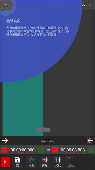 小编这边以剪辑音频为例,我们选择好一段需要处理的音频文件打开(也可以现场录制),随后即可看到该文件在音频视图中展开了,在该视图总可以剪辑音频的长度,最长可达到100毫秒。