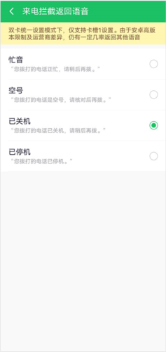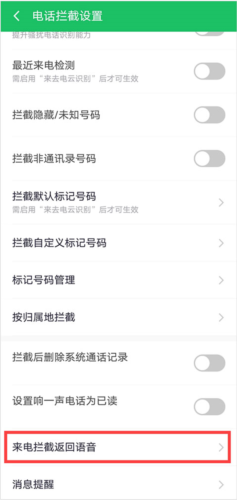 2、在“骚扰拦截”界面选择“电话拦截设置”——“电话拦截返回语音”