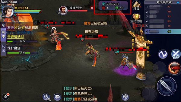 双方分为神魔两阵营,守护各自的主基地:镇妖剑和魔剑。点击任务栏可自动锁定对方主基地前往攻击。对主基地的攻击与伤害无关,攻击固定次数可将其摧毁,优先摧毁敌方主基地的阵营提前获得胜利。(豪侠同学们不用担心,每一次攻击算两下!)