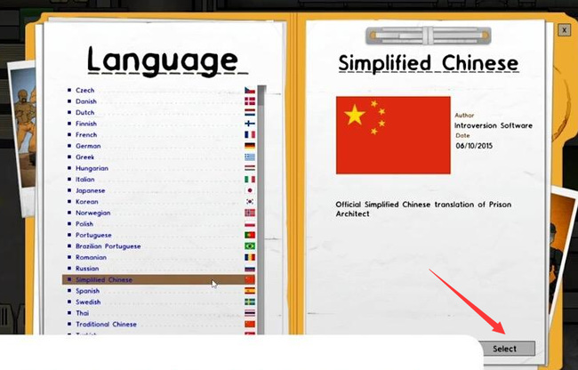 3、在language界面选择中国国旗对应的语言选项,点击右下角“select”完成中文设置。