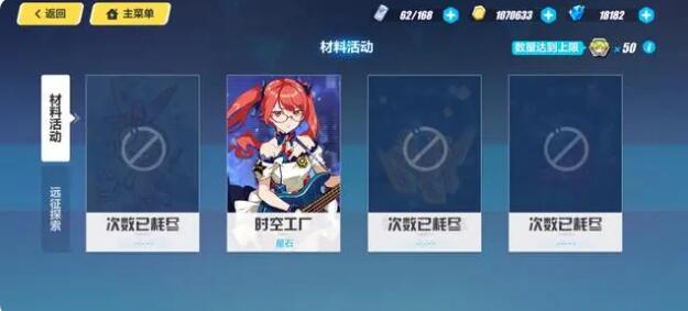 2、接着是材料,在材料远征这里,这里面的材料都是你以后武器和圣痕升级进化的主要材料。时空工厂主要是产星石,星石主要用来买一些材料和人物碎片,这个本不用刻意刷一天三四次就够了。