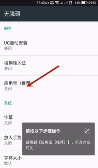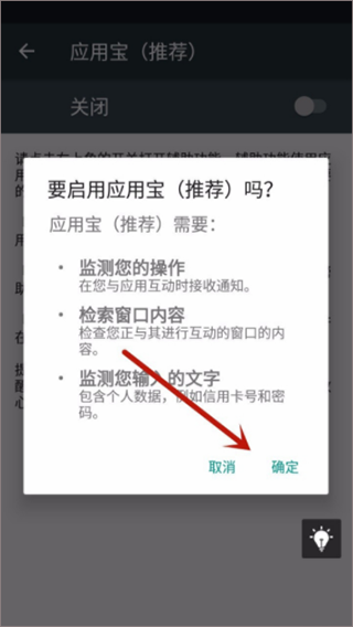 6、将右上角的辅助功能打开一下,这时候会提示“要启用应用宝推荐吗?”点击一下“确定”应用宝就可以自动安装软件了;
