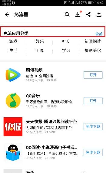 6、进去免流应用分类之后,我们可以看到哪一些应用下载之后,继续使用这些应用也是免流量的