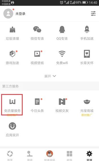 2、进去之后,点击底部的管理,下滑找到第三方服务,选择免流量服务