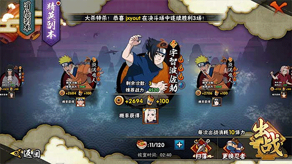 2、精英副本:精英关卡是需要玩家们通过冒险副本来解锁,成功挑战某一关卡过关后才可以挑战精英副本。精英副本每天挑战的机会只有三次,每次挑战需耗费10点体力值,但首次挑战成功可以返还10点体力值,挑战成功可以获得经验、铜币和忍者碎片。想要快速收集足够的忍者碎片,这还是很稳定的一个方法,玩家可以通过扫荡轻松获得需要的忍者碎片。