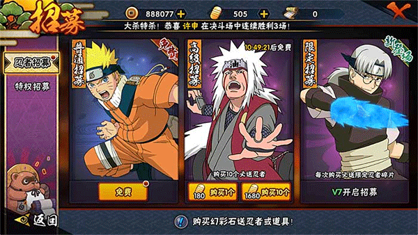 1、忍者招募:在这个看脸的世界里面,所有的不得意都可以怪脸不好,在《火影忍者》手游里面,最看脸的玩法就是忍者招募(抽抽抽)!忍者招募的玩法是通过消耗【羁绊之卷】随机抽奖,玩家会有一定的几率抽到忍者碎片。高级招募和普通招募基本上是一样的,但由于需要消耗金币抽奖,所以每抽十次一定会送一个忍者,金币充裕的玩家们可以试一试。至于限定招募和特权招募就是土豪玩家的玩法了。