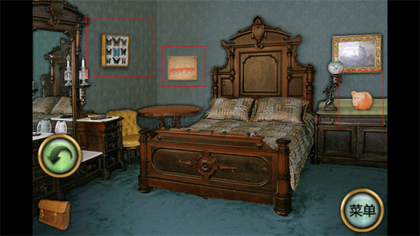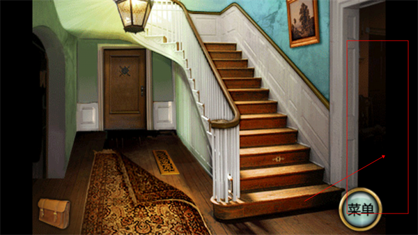 3、点击楼梯最上面,进入二楼,可以看到四个房间门,点击右边第一个房间进入,注意小猪存钱罐、墙壁上的蝴蝶标本、一幅画。