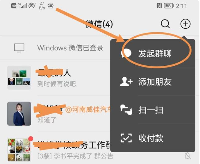1、打开微信,点击右上角的加号,在弹出的下拉菜单中选中【发起群聊】,点开,这时候,界面里就会显示很多微信好友。只用在这些微信好友前面的圆圈上分别点一下,就会把想要拉他们进群的好友选定。