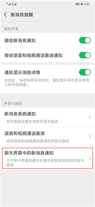 4、可根据自己的需求选择提示的项目,例如【聊天界面中的新消息通知】开启【声音】和【振动】提醒;