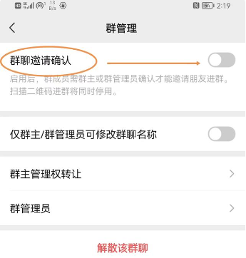 7、设置【群聊邀请确认】。在群设置页面有个【群管理】按钮,点开后,在第一项,就是【群聊邀请确认】,打开它右侧的开关,这样进群的新成员都要经过群主的验证确认,方可进群,这个设置可以保证群成员的纯洁性,不至于什么人都可以进群。