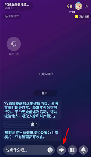 4、创建频道后将直接进入房间,此刻点击下方的分享键,可以将房间链接分享给好友连麦打游戏。