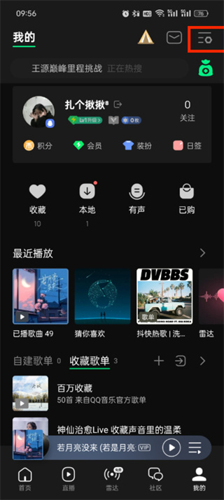 1、首先打开qq音乐软件,进入到首页中后我们可以切换到直播、雷达、社区、我的页面,我们点击右下角的【我的】;