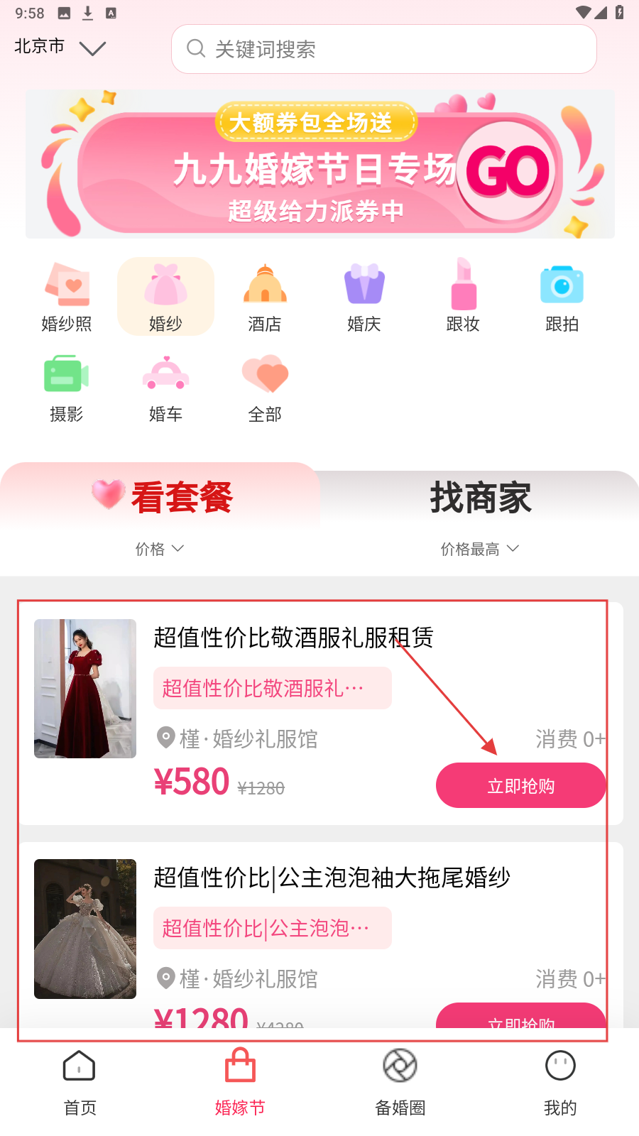 1、打开应用,在【婚嫁节】页面,按需选择要进入的分类,如点击【婚纱】。