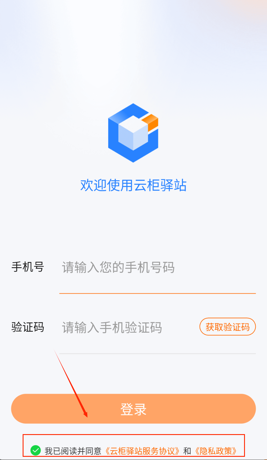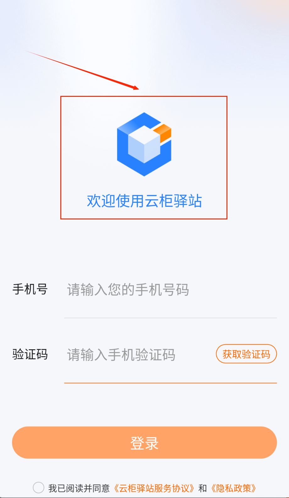 1、打开软件就能看到蓝色图标和"欢迎使用云柜驿站"的欢迎语,界面设计简洁明了,让人感觉很舒服呢。