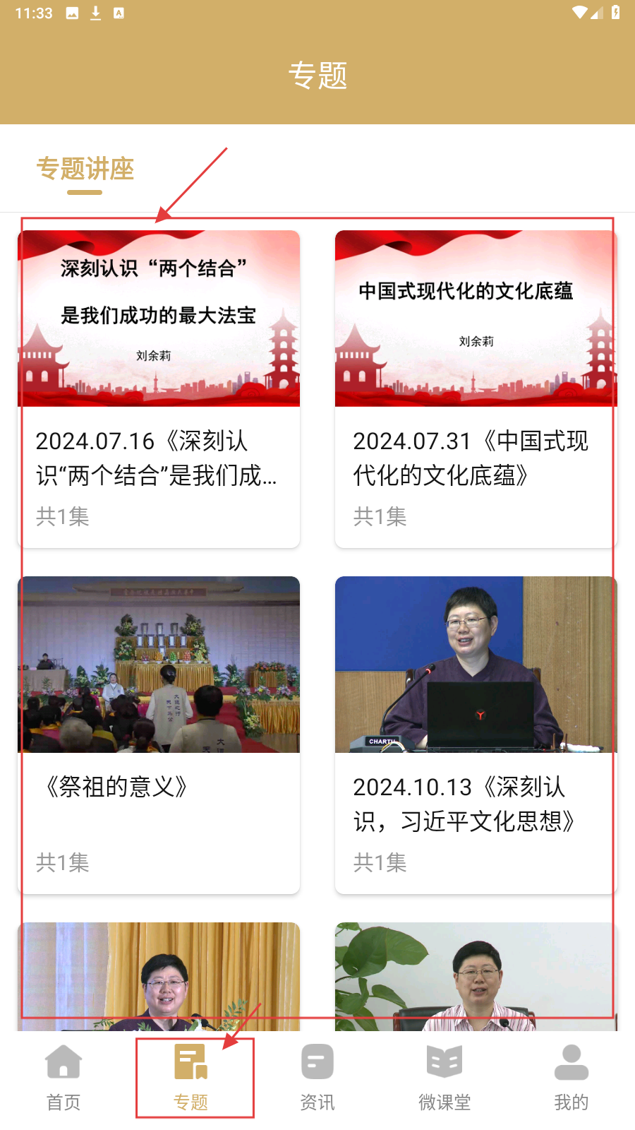 4、切换到【专题】页,浏览【专题讲座】列表,按需选择对应讲座进行学习。